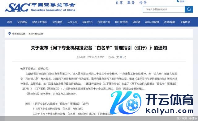 为相助作念好全面深刻成本市集编削职责,加强网下投资者询报价动作监管,股东构建邃密网下刊行市集生态,中国证券业协会(以下简称"中证协")制定了《网下专科机构投资者"白名单"处分带领(试行)》(以下简称《处分带领》),并自 1 月 3 日发布之日起扩充。中证协还提到,酌量在证券、基金、保障等金融机构范围内试点先行,徐徐将"白名单"膨胀讹诈到其他类型市集机构。在业内东谈主士看来,高质地的网下投资者玩忽在市集波动时保捏感性,幸免盲目跟风或急躁性抛售开云体育,有助于增强成本市集的内在踏实性,减少市集大幅波动的风险。