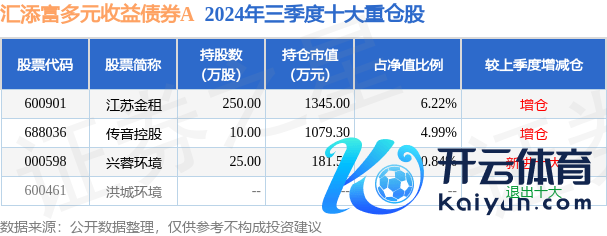 汇添富多元收益债券A为债券型-夹杂二级基金,凭据最新一期基金季报败露,该基金钞票成立:股票占净值比12.06%,债券占净值比104.94%,现款占净值比4.77%。基金十大重仓股如下: