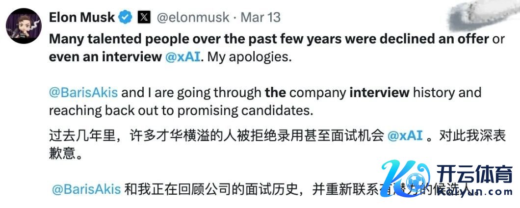 此外,马斯克还在支吾平台萧瑟谈歉:“畴前几年里,好多才华横溢的东谈主被xAI拒却了就业契机致使口试契机。我对此暗意歉意。”他暗意将再行筹办那些有后劲的候选东谈主。