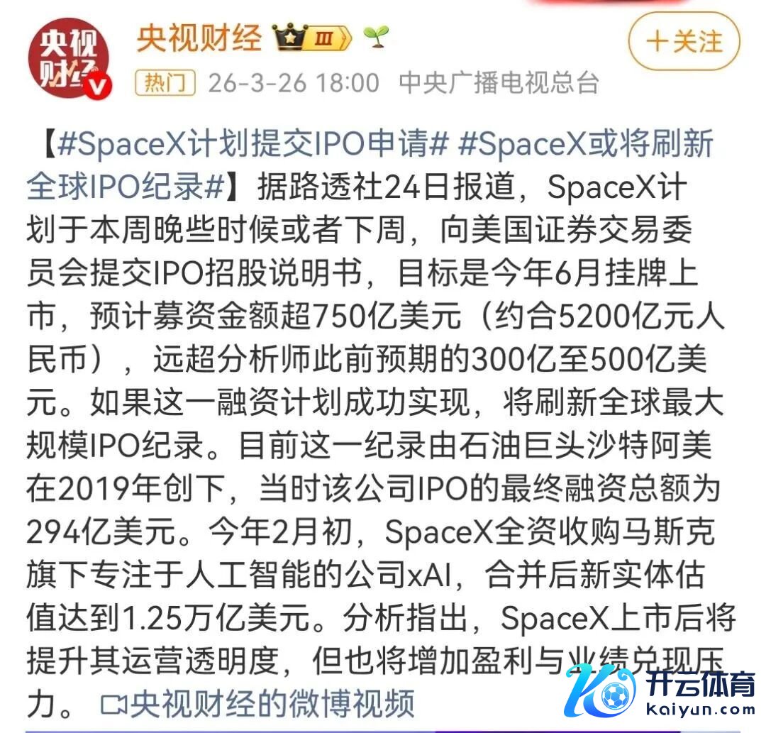 与此同期,SpaceX正在筹备史上估值最高、可能达1.75万亿好意思元的IPO之一。