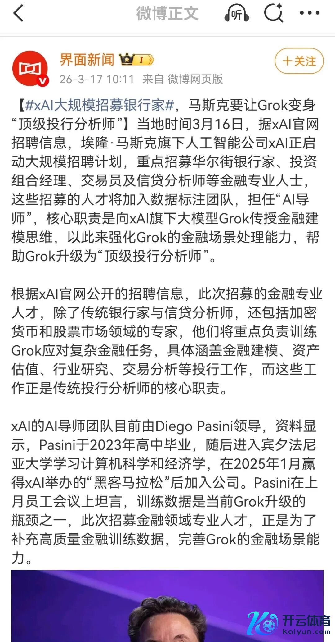 前不久,xAI还启动了一项大范围招聘计算,要点从华尔街挖掘银巨匠、交往员等金融专科东谈主才,让他们担任AI导师,将Grok检会成为具备专科才调的顶级投行分析师。