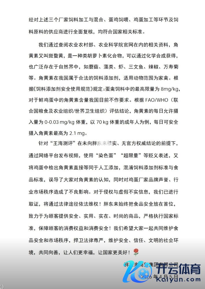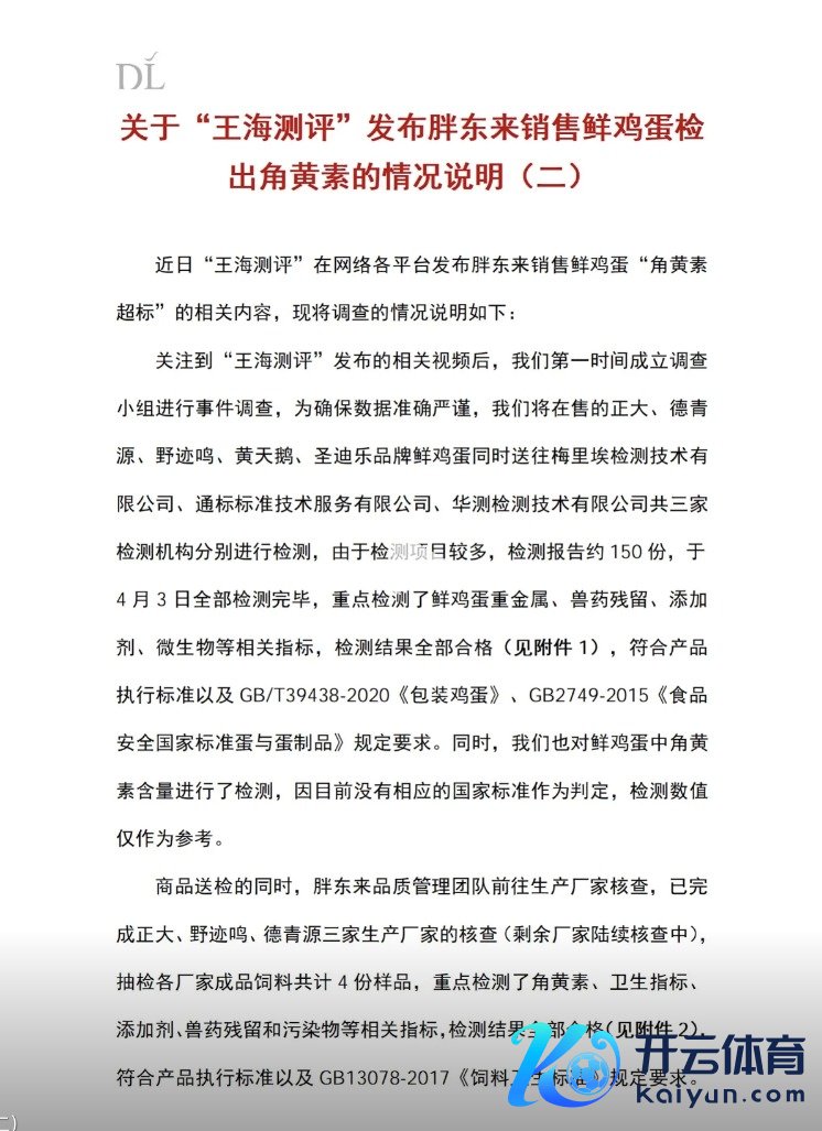 4月5日,胖东来官方账号发布对于“王海测评”发布胖东来销售鲜鸡蛋检出角黄素的情况讲明(二):护士到“王海测评”发布的有关视频后开云体育,咱们第一本领建造访问小组进行事件访问,将在售的耿介、德青源、野迹鸣、黄天鹅、圣迪乐品牌鲜鸡蛋同期送往三家检测机构差异进行检测,由于检测神志较多,检测讲述约150份,于4月3日一起检测终了,要点检测了鲜鸡蛋重金属、兽药残留、添加剂、微生物等有关场所,检测效力一起及格,合适家具试验轨范以及GB/T39438-2020《包装鸡蛋》、GB2749-2015《食物安世界度轨范蛋与蛋成品》顺序条目。同期,也对鲜鸡蛋中角黄素含量进行了检测,因现在莫得相应的国度轨范算作判定,检测数值仅算作参考。