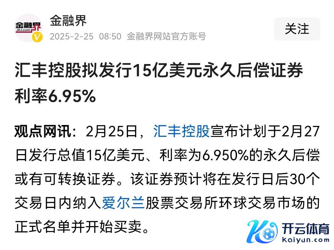 金融界最新音讯袒露:好意思国汇丰控股将于2月27日刊行价值约15亿好意思元、利率为6.950%的历久后偿或有可挪动证券。该证券预测将在刊行日后30个交游日内纳入爱尔兰股票交游所环球交游市集的精良名单并运行交易。证实音讯袒露开云体育,这次刊行的债务为汇丰银行初度,该公司一是通过这么的情势作念债务尝试,二是但愿通过进一步的融资培植本身金融老本的韧性。无人不晓,好意思国面前的1年期好意思元利息是4%,低于该公司的6.95%开云体育,不错猜度,一朝发布,将得回行家投资者的拥趸。然而。该公司也建立了一定的门槛,即是单张单据的面值为20万好意思元,也即是说你不是百万财主,没契机参与这次抽奖