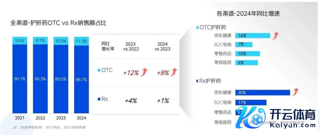 另外,护肝药全渠说念OTC(非处方药)销售额快速增长,B2C(企业通过互联网平直向消费者销售居品和劳动)电商平台成为集采后Rx(处方药)护肝药处方外流的主要衔接渠说念。